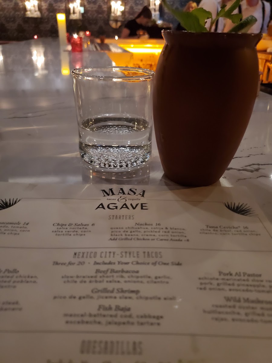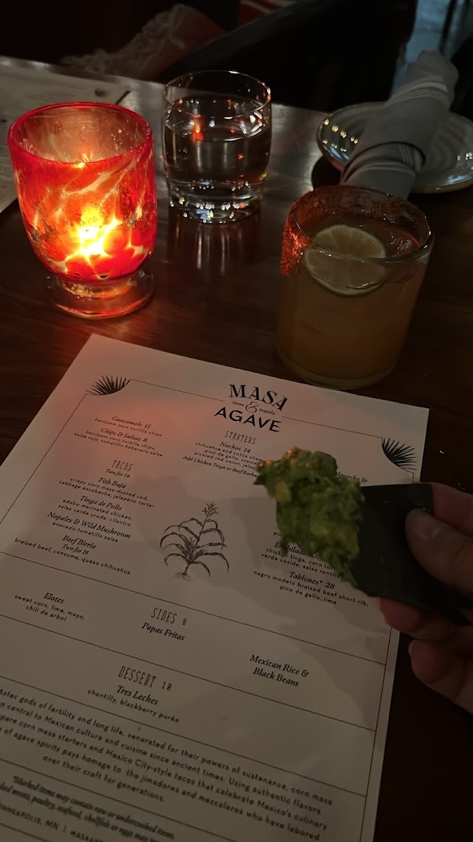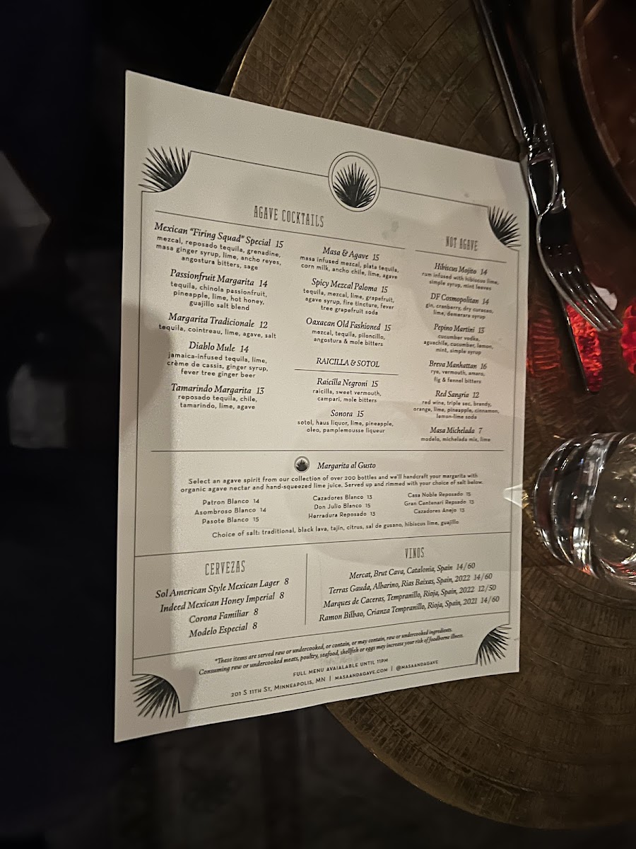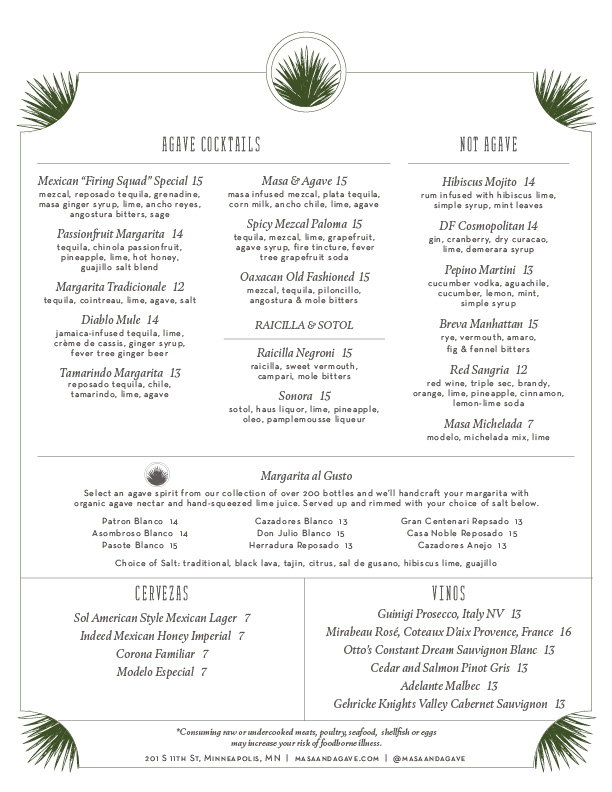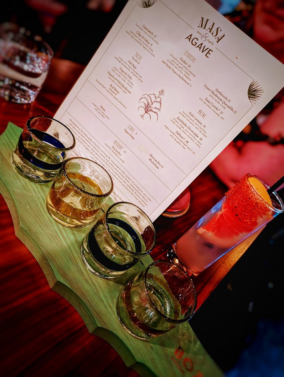 mezcal, reposado tequila, grenadine, masa ginger syrup, lime, ancho reyes, angostura bitters, sage